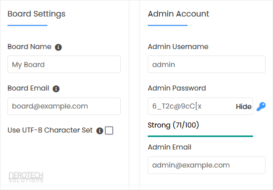 • Admin Username: Your new AEF username (for security reasons, do not use the administrator or the admin username).